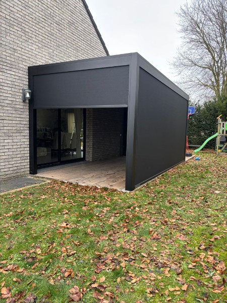 À Angres, une terrasse déjà agréable s’est transformée en véritable espace à vivre grâce à l’installation d’une Pergola Bioclimatique avec stores Screens intégrés