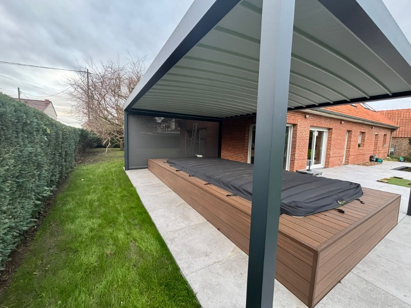 Installation d’une pergola Fly parfaitement intégrée au-dessus du spa, accompagnée d’un screen équipé pour assurer confort, protection solaire et intimité en toute élégance.